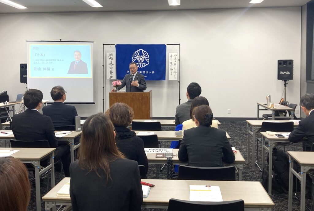 【MSレポート】「きる」 2026.01.27 2026年1月22日㈭モーニングセミナー講師は、 一般社団法人倫理研究所 法人局法人スーパーバイザー 影山 伸和 氏 「きる」 講話中の様子 講師:影山信和氏 <「きる」とは…?> 講師の倫理入会~現在までの経緯も交え、講話テーマの「きる」とは何を意味しているのか、お話しいただきました。ご自身の会社での体験、過去にお世話になった社員さんと自分の心や感情がすれ違ってしまった際、当時受けた「倫理指導」からの学び。立場によって見てる世界も違い、思いも違う。家族間でも社内でも、普段の自分の心持や行動の中で大事にしたいことが「~きる」という単語に込められていることを教えていただきました。 栞の輪読中 真剣な3名 会長挨拶:橋爪会長 会員スピーチ:中井副専任幹事 朝食会で感想をシェア 新会員の方も発表 伊勢かぐらばリゾート千の杜三重県伊勢市佐八町 池の上1165−1 美しい伊勢の森に囲まれ、伊勢神宮の外宮から玉城方面に向かう途中にある癒しのホテル、千の杜さん。会議室「かたらい」にてモーニングセミナーを開催中! その他ブログ 2026.01.25 【MSレポート】苦難の先にある奇跡 2026.01.18 【MSレポート】同族経営と同志経営 2025.12.28 【MSレポート】当たり前な日常に幸せを感じる もっと見る